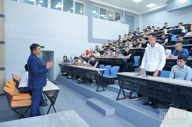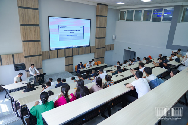 Today at 10:00 in the 1st gallery of the Fergana Polytechnic Institute, under the initiative of the head of the Marketing and Student Practice Department O. Soliyev, with the participation of graduating students who want to work in state organizations, the Public Service Development Agency under the President of the Republic of Uzbekistan, Fergana The staff of the branch, Chief Inspector H. Husanov, Inspector O. Ahmadaliyev, Assistant Inspector S. Rahmonov, held an open seminar-training session on the topic "Open way to civil service of a democratic state".