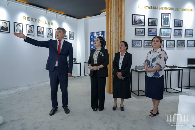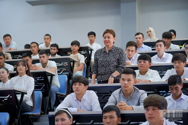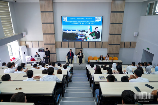 meeting, the first vice-rector Sh. Dehkanov introduced the entrepreneurs to the A meeting "Entrepreneur and youth" was organized at the Fergana Polytechnic Institute with the winner of the Medal “Shukhrat”(Fame), the head of "Art House Sadosh" LLC in Fergana, Sadokat Mirzayeva, with the participation of students of the institute.